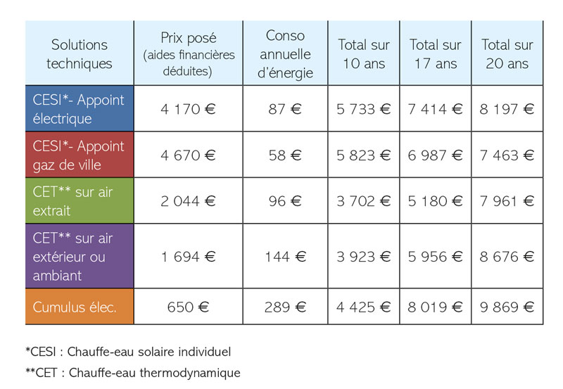 L’association a comparé le coût à l’achat et à l’usage d’un cumulus électrique, d’un chauffe-eau solaire individuel (CESI) et d’un chauffe-eau thermodynamique (CET) pour une famille de 4 personnes.