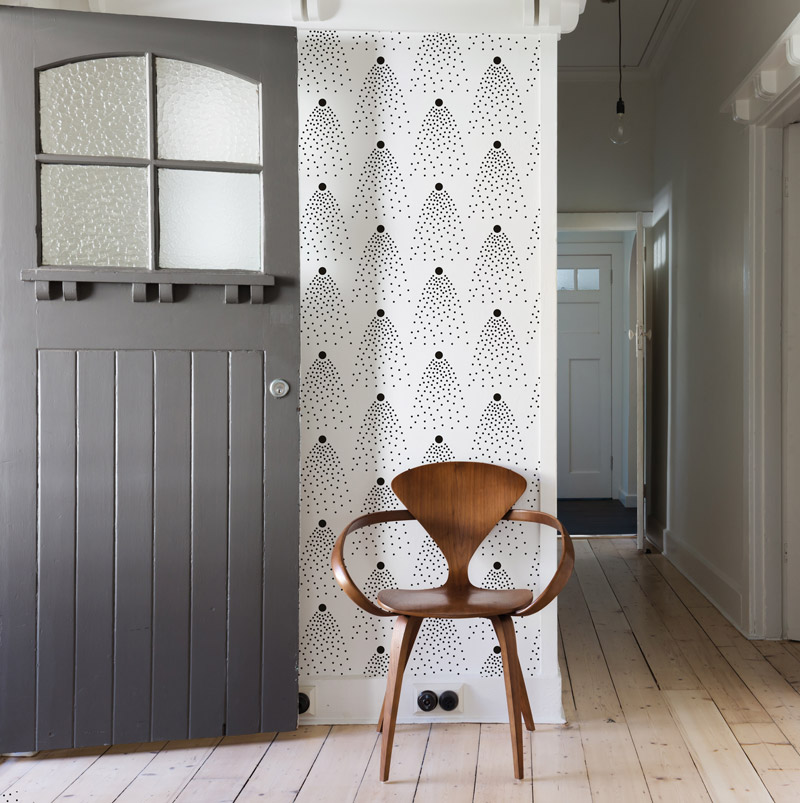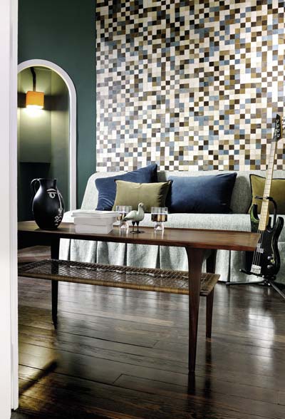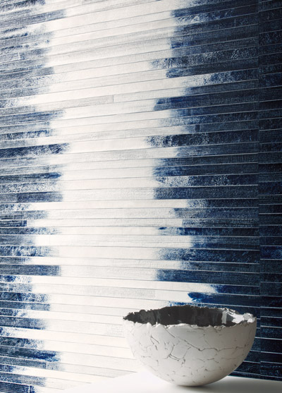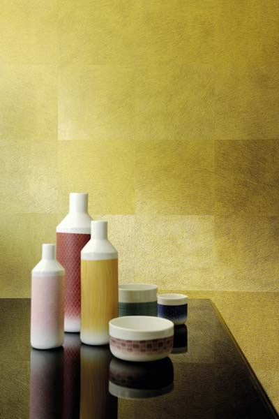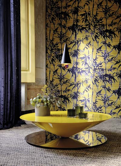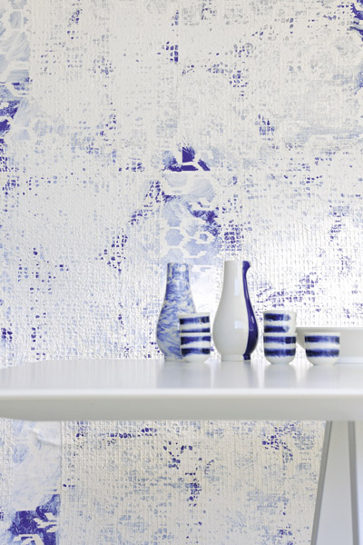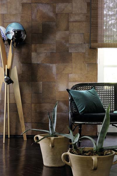 Aux confins de l’art et de l’artisanat, sa collection Manado, parue cette année, est en écorce de bananier peinte et papier de soie sur intissé. Elle se pose sans raccord.