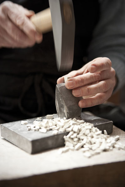 Dans son atelier toulousain, la mosaïste Ariane Blanquet taille avec sa marteline et son tranchet des plaques de biancone en petites tesselles. De ce marbre blanc qu’elle aime tant s’échappe, lorsqu’elle le taille, un son léger. Ensuite, sur une grande table, elle assemble chaque pièce avec patience et rythme. Autour d’elle, partout des étagères, qui stockent mille matériaux : marbres, verre, émaux, galets… « Ce sont des matières vivantes. Quand je les travaille, ces matériaux m’offrent des sons, des odeurs parfois. Le marbre noir par exemple contient du soufre qui sent mauvais. Certains matériaux sont tendres, d’autres cassants… » Bienvenue dans l’atelier de la mosaïste Ariane Blanquet.