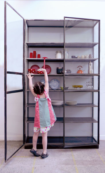 Vaisselier style industriel, sur-mesure, tout en acier et verre. Étagères en tôle perforée.Les verres sont montés dans des cadres en acier.