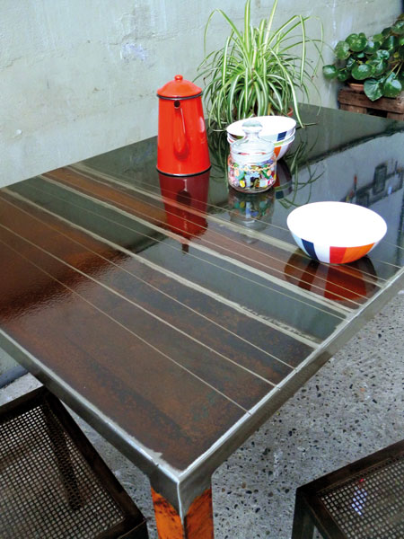 Camille Bertrou coupe, soude, assemble des profilés métal pour former des volumes. « Le travail de l’acier offre des possibilités de création infinies », explique-t-elle. Ses créations prennent des formes très variées : « Je vais m’inspirer du métal que j’ai sous la main pour créer des pièces. C’est la matière qui me guide. Avec une chute d’acier, je vais imaginer un arbre à bijoux, un bout de tôle rouillé sera plutôt une base pour un plateau ». Et en ce moment, l’artisane fait des verrières. La demande est telle, qu’elles monopolisent quasiment toute son activité. Mais elle répond toujours aux demandes de mobilier car elle l’avoue : « c’est ce que je préfère ».