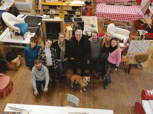 L’histoire de ce lieu remonte à 2017. Diplômés de l’Institut des Métiers d’Art et de l’Artisanat d’Art de Revel, Jérémy Grondin et la céramiste Nathalie Collados cherchent un atelier à partager. Le but : réduire les charges et en profiter pour rencontrer d’autres métiers, d’autres créateurs. L’idée fait boulle de neige. De nouveaux candidats se greffent au projet. Ce n’est qu’en 2019 que le local de la rue Michel-Ange à Toulouse leur est proposé. Depuis, comme une ruche, chacun s’y affaire : Jérémy Grondin et Nathalie Collados, les tapissières décoratrices Maïotte Cartiaux (Au printemps du fauteuil) et Wendy Martinez (Atelier Silla), le créateur d’objets en bois recyclé Julian Diaz (Atelier Julian Diaz), la céramiste Hilde Segers et la mosaïste Selma Ghachem. Enfin, les a rejoints Benjamin Canty avec son entreprise Les Jeunes Pousses qui a installé une serre dans l’atelier pour ses productions de jeunes pousses à destination des restaurants toulousains.