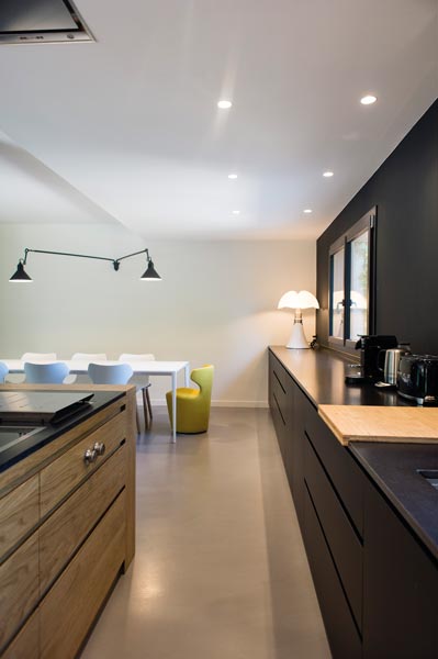 La cuisine sur-mesure. Îlot central en trois plis (Tilly). Les façades du meuble noir sont plaquées par un stratifié Fenix noir mat, « glacé comme une laque mate, très doux au toucher », précise Christine Clavère. Le plan de travail est un granit noir du Zimbabwe finition cuir. Électroménager Gaggenau. Suspensions Tobias Grau.