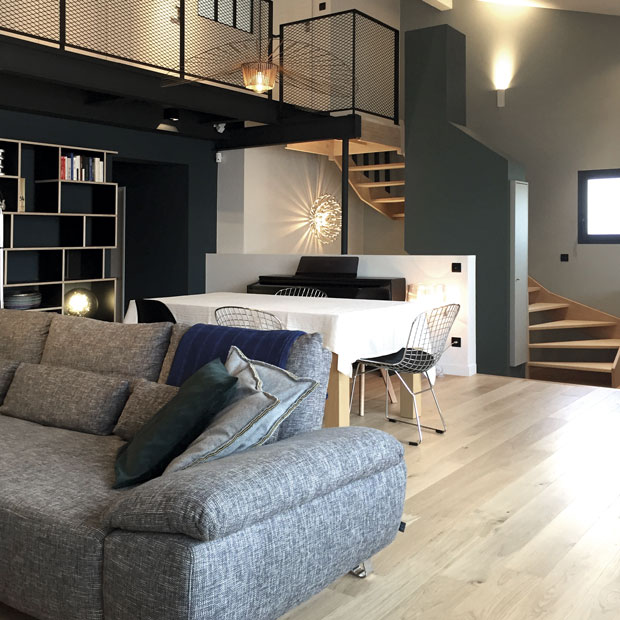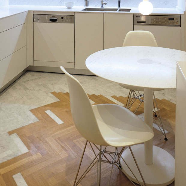 Plancher en chêne et marbre dans cette cuisine d’un appartement de l’hypercentre de Toulouse rénovée par Pulp Intérieurs. Très beau parquet en chêne massif collé. Pose à bâtons rompus, avec incrustation de marbre. « Dans cet immeuble ancien datant du XVIIIe siècle, le carrelage existant de la cuisine avait fissuré suite à