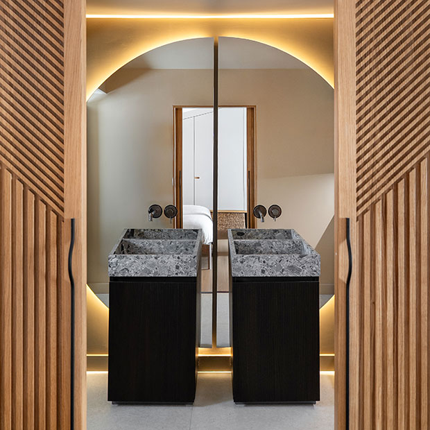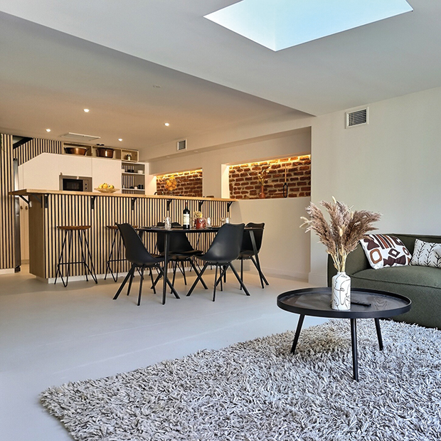 Studio Hey signe une nouvelle réalisation hors norme à Albi. Par un jeu de lumière et de matières, Julie Lacroux et Claire Vauvarin ont transformé un rez-de-chaussée en lieu de vie au décor singulier. LA RÉDACTION – PHOTOS JEAN PELLAPRAT DE VISIBLE Un espace bureau est aménagé dans le salon. Les couleurs du mobilier sur