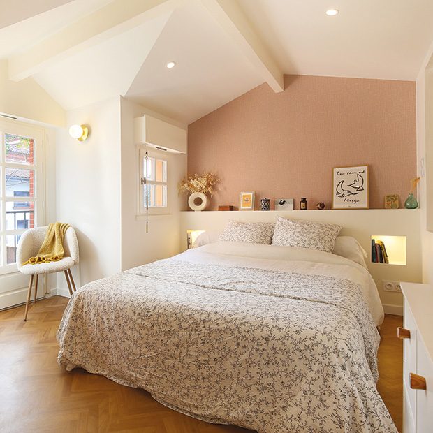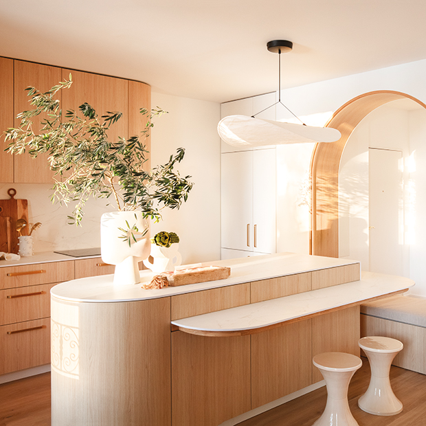 Rondeur, douceur et féminité signent les projets de Cindy Petitprez. Un fil conducteur qui n’a pas échappé à cette rénovation en plein hypercentre toulousain. LA RÉDACTION – PHOTOS LAURENT MIAILLE Rondeur. Le mobilier de la cuisine a été fabriqué par l’artisan d’Artef Menuiserie (Carbonne). Façades effet chêne Egger et plans de travail en compact effet