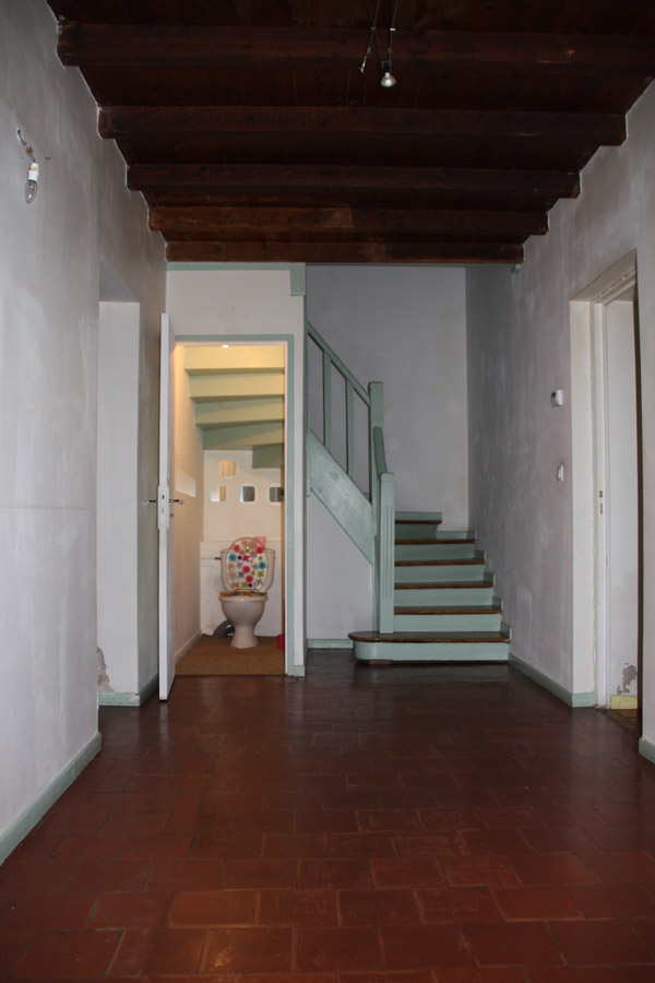 Cage d’escalier de la maison principale. 5,50m de hauteur sous plafond. Lampions en soie rapportés d’un voyage au Viêt-Nam et mis en scène par Dominique. Très légères variations lumineuses en intensité et couleur. Escalier d’origine. Marches en peuplier décapé. Première marche en pierre. Limon peint en gris. Sol de la cage d’escalier en tomettes de terre cuite. Ensemble splendide.