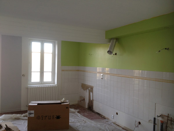 Dans le gîte : cuisine et salle à manger. Cuisine Ikea, spots encastrés au-dessus de l’îlot, plan de travail conçu par le menuisier Dazéas. Tabourets Maisons du Monde, réplique des tabourets Tolix. La table de la salle à manger est une table de famille customisée, entourée de chaises de récupération et de chaises La Redoute. Suspensions Castorama. Peintures verte et grise réalisées par le peintre Gilles Frument, Isabelle a peint le reste de la pièce en blanc. Au sol, tomettes d’origine. Les tableaux sont de Duke.