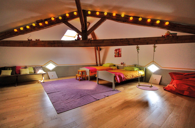 Dans le gîte : dortoir pour les enfants (4 lits). Charpente d’origine en peuplier décapée et vernie, parquet en frêne. Soubassement vert de gris, ligne rose orangé, balançoire suspendue.