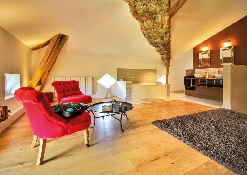 Chambre et sa salle de bains dans le gîte. Avant les travaux, cette pièce était des combles non aménagés aux murs de terre crue. Après travaux : murs blancs, marron foncé et marron beige, parquet en frêne, charpente en peuplier d’origine décapée. Le long du mur, le coffrage dissimule des spots pour un éclairage ascendant. Suspensions AM.PM. de La Redoute. Salle de bains en petite mosaïque de pâte de verre, avec double vasque et baignoire.
