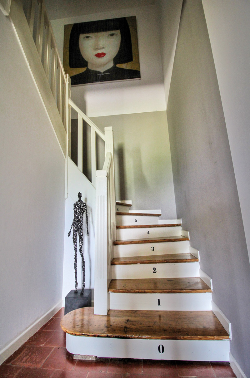 Escalier dans le gîte. Escalier d’origine. Sol en tomettes de terre cuite. Murs peints en blanc par Isabelle et en gris par le peintre Gilles Frument. Marches en chêne vitrifié. Contremarches peintes en blanc et numérotées. Sculpture de Yod. Tableau d’Attasit Pokpong.