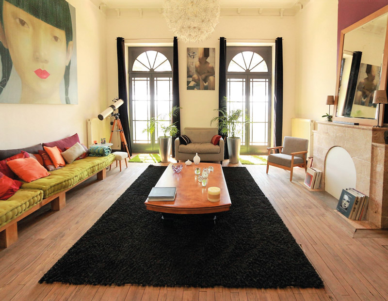 Salon de la maison principale. Plancher, cheminée et corniches d’origine. La table basse est une table de salle à manger chinée par Isabelle et dont elle a coupé les pieds. Fauteuil bois Maisons du Monde, large fauteuil Habitat, tapis et lustre Ikea, canapé La Redoute. Tableau à gauche d’Attasit Pokpong, tableau au centre de Jin Bo.