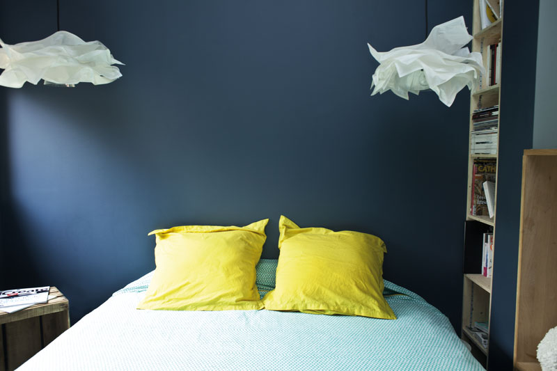 Pour la suite parentale, sans agrandir, il a fallu ruser. Entre la chambre et la salle de bains, Aurélie Avrieu a imaginé un meuble dressing en contreplaqué à traverser. Quant à la chambre d’appoint, une mezzanine sur l’escalier, ajoutée au palier, va offrir un espace de 10 m2.