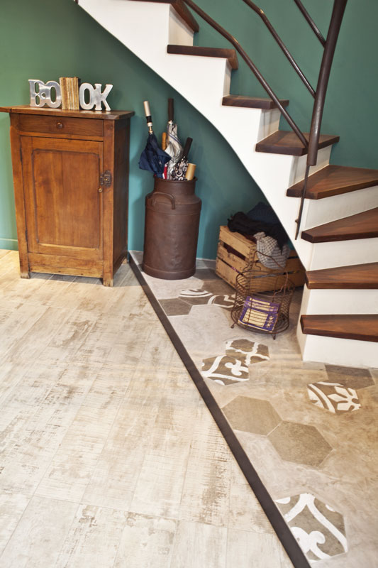 Au rez-de-chaussée, tous les sols, y compris celui de la suite parentale, sont en carrelage imitation bois blanchi à pose droite. « La pose droite, explique Aurélie, casse l’imitation du bois. Le but n’est pas de dire : c’est du bois. Ce revêtement de sol dans le salon donne l’impression d’être sur un ponton qui guide vers l’extérieur, par-delà les baies vitrées et la terrasse, jusqu’au jardin. » Un faux-plafond a été aménagé, des spots y sont encastrés, réglés par des variateurs. La plupart des peintures de la maison proviennent de la collection inspired by Pantone de Tollens. Aurélie Avrieu justifie l’usage de la couleur : « Dans le blanc, l’œil ne voit ni les volumes, ni les formes, il aplatit tout. La couleur aux murs permet de jouer avec les volumes, de renvoyer la lumière et d’illuminer une pièce ».