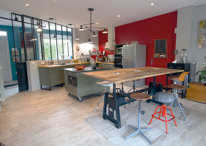 Cuisine créée par l’architecte d’intérieur et réalisée par le menuisier et le ferronnier. Murs peints en rouge carmin. Faïence de crédence Leroy Merlin type carreaux de ciment. Plan de travail en granit pour l’ilot, en chêne pour le reste. Petites étagères et tiroir en tôle perforée conçus par le ferronnier. Hotte Ikea. Suspensions La Redoute.