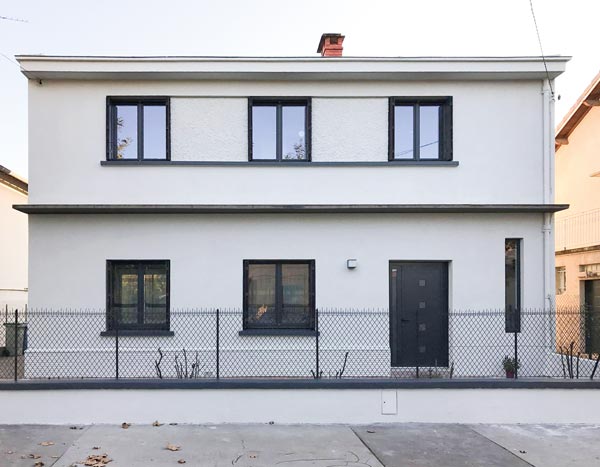 Façade côté rue. Le ravalement de façades est aussi l’occasion de donner un coup de jeune au muret de clôture. Il est traité comme la façade. La dalle du premier étage sort en saillie sur la façade côté rue pour former une casquette. Elle protège le passage de la pluie et les pièces du rez-dechaussée du soleil l’été. La casquette est peinte en gris anthracite. Une couvertine en zinc la recouvre et la protège.